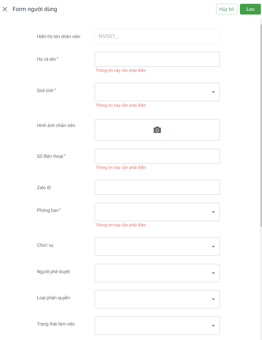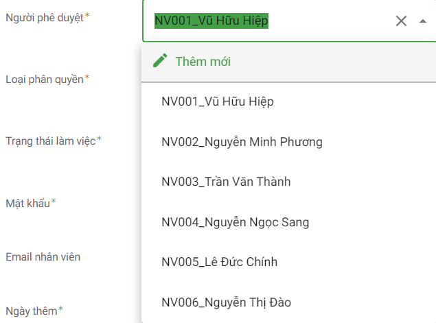 Trong trường hợp người phê duyệt chưa có thì bạn có thể ấn vào Thêm mới để thêm nhân viên mới cho App trước rồi mới có thể chọn được.