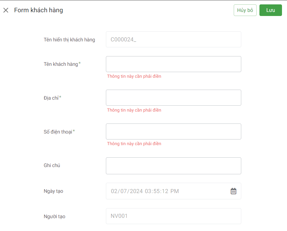 Các thông tin của khách hàng sẽ được tự động lấy từ thông tin khách hàng mà bạn đã tạo trước.