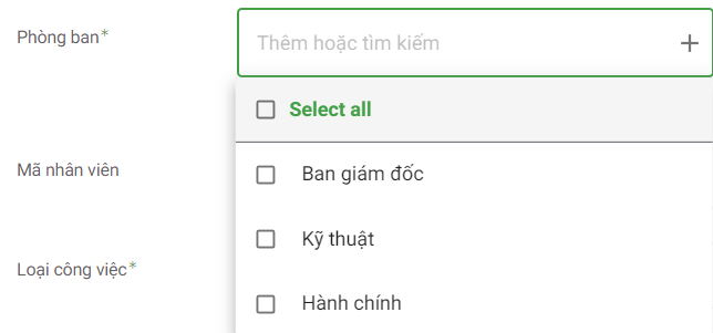 Với phòng ban thì bạn có thể chọn trong danh mục đã có hoặc có thể tự gõ thêm các phòng ban mới nếu có.
