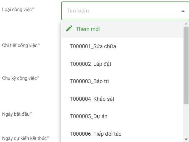 Với Loại công việc thì bạn có thể chọn trong danh sách loại công việc đã tạo từ trước hoặc ấn vào Thêm mới để tiến hành tạo thêm.