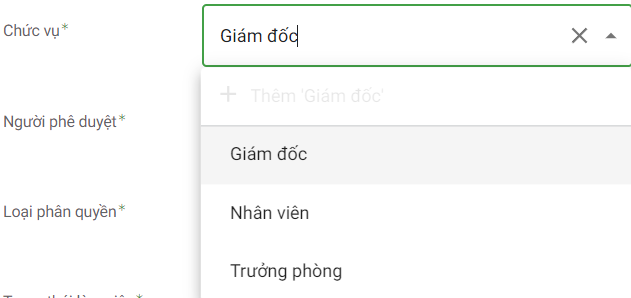 Tương tự như chức vụ bạn cũng có thể chọn các chức vụ sẵn có hoặc gõ thêm chức vụ mới và ấn thêm là được.