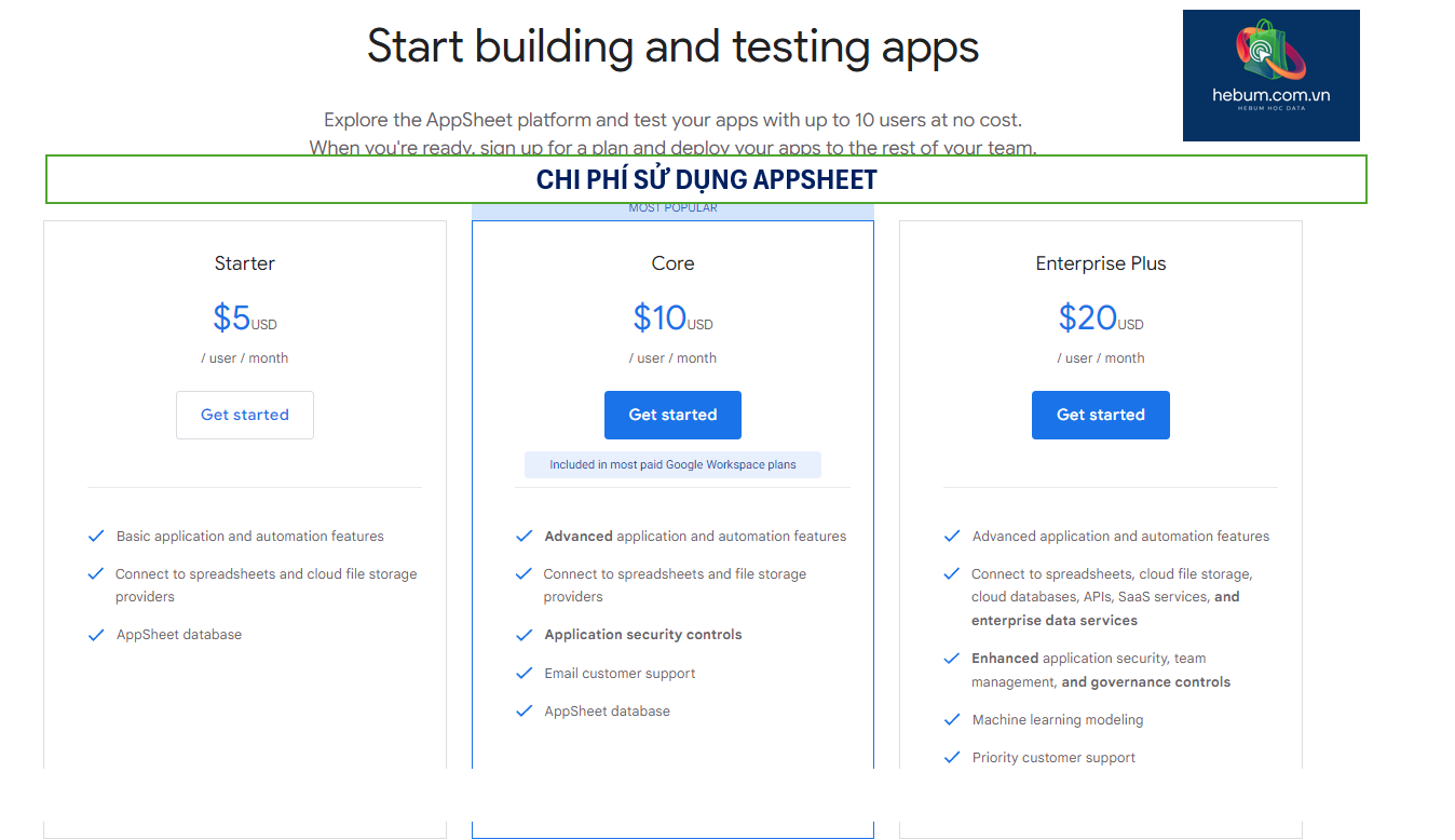 - AppSheet Pro: 10 USD/người dùng/tháng.
