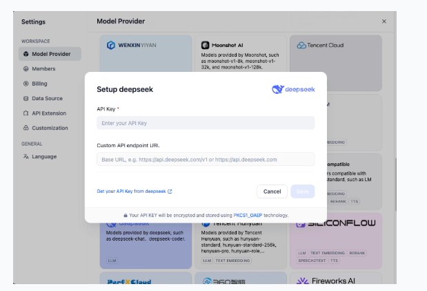 Trước tiên, bạn cần lấy và thêm Khóa API DeepSeek của mình trong "Cài đặt" -> "Nhà cung cấp Mô hình".
