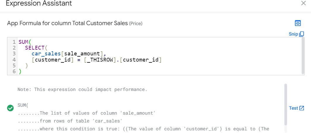 Ở đây tham số đầu tiên là bạn chỉ rõ bạn sẽ lấy ra cột sale_amount trong bảng car_sales. [customer_id] = [_THISROW].[customer_id] là điều kiện lọc.