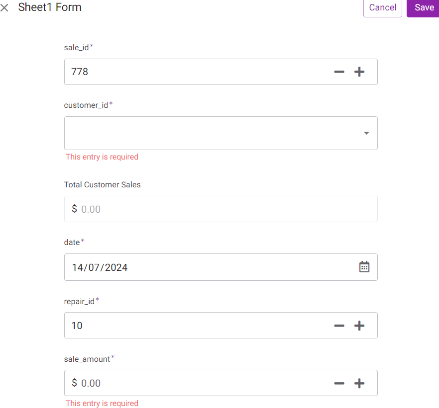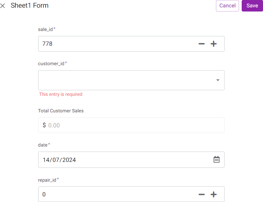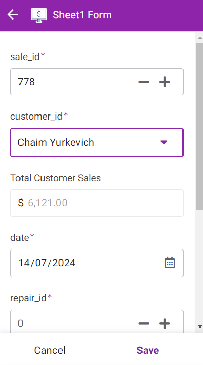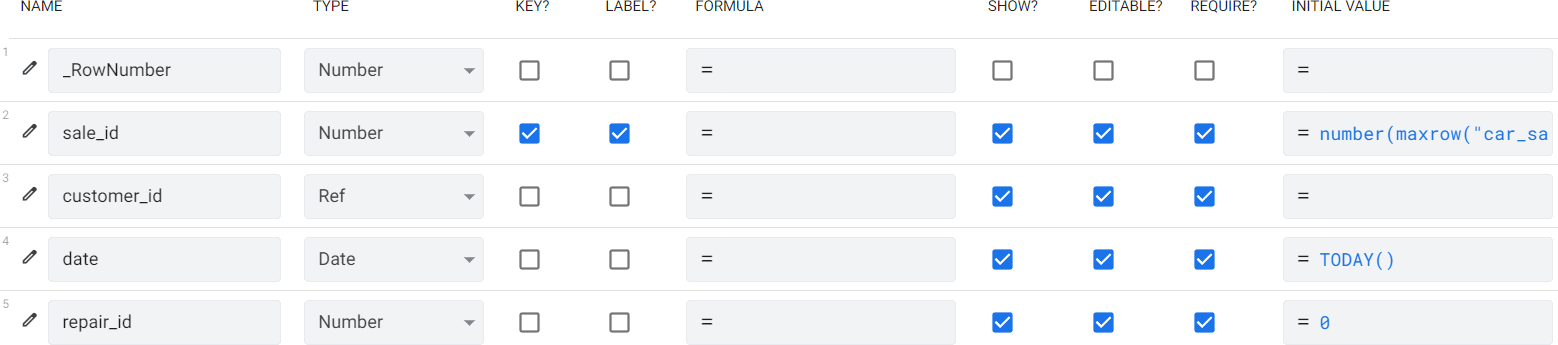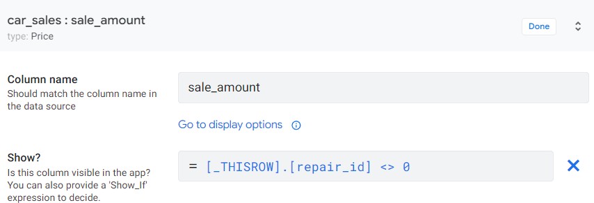 Ta sẽ demo thêm 1 ví dụ là nếu repair_id <> 0 thì cột sale_amount mới hiện ra để bạn có thể chỉnh sửa. Lúc này ta sẽ sử dụng chức năng show_if trong AppSheet.