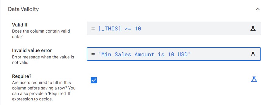 Ví dụ về Valid_If. Ta sẽ tạo chức năng check cột sales_amount sẽ cần >= 10 thì mới valid khi nhập liệu. Ta sẽ làm như sau.