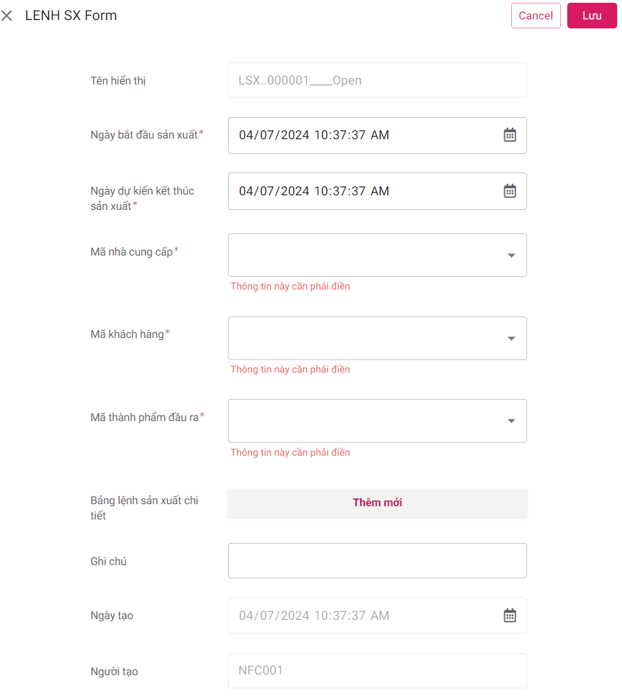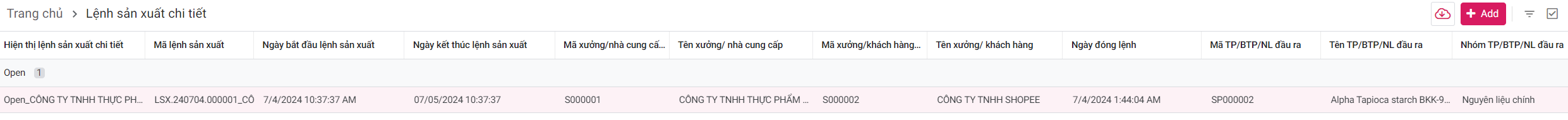 Dưới đây là giao diện lệnh sản xuất chi tiết.