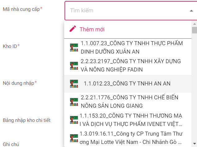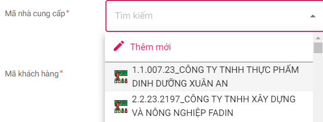Với mã nhà cung cấp thì bạn có thể chọn trong danh sách nhà cung cấp đã tạo sẵn hoặc ấn vào Thêm mới để thêm các nhà cung cấp mới.