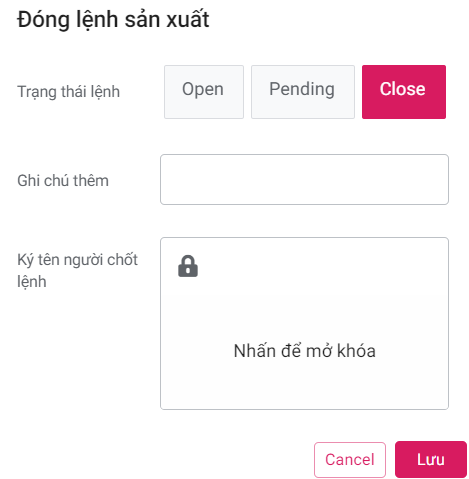 Chức năng đóng lệnh sản xuất sẽ đảm bảo là khi chức năng này đã được bật thì lệnh sản xuất sẽ không chỉnh sửa được nữa.