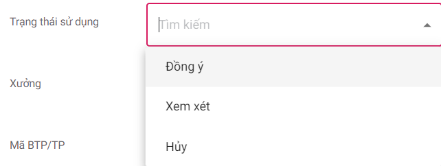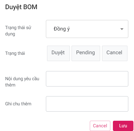 Với trạng thái sử dụng thì BOM đang gồm 3 trạng thái là Đồng ý, Xem xét và Huỷ.