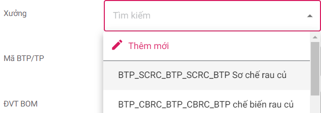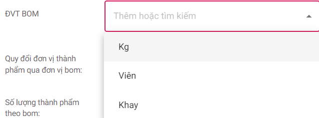 ĐVT BOM là đơn vị tính của sản phẩm được tạo thành sau khi tiến hành sản xuất. Nếu đơn vị tính đã tồn tại thì bạn có thể chọn nhanh theo list được sổ ra hoặc có thể gõ thêm giá trị mới và ấn thêm là được.