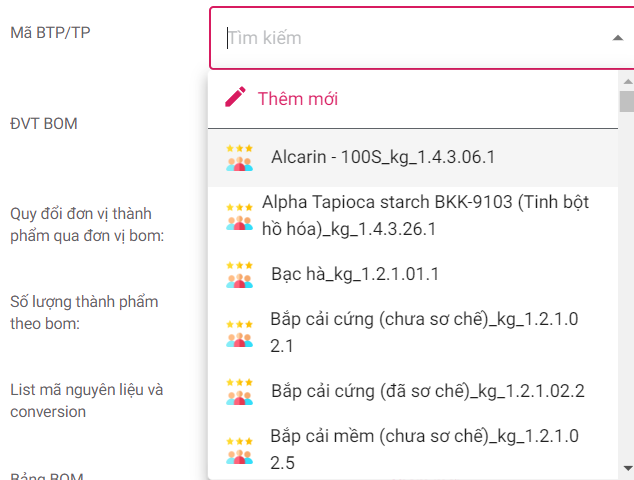 Tiếp theo tại phần mã BTP/TP bạn cần chọn mã sản phẩm được tạo thành.