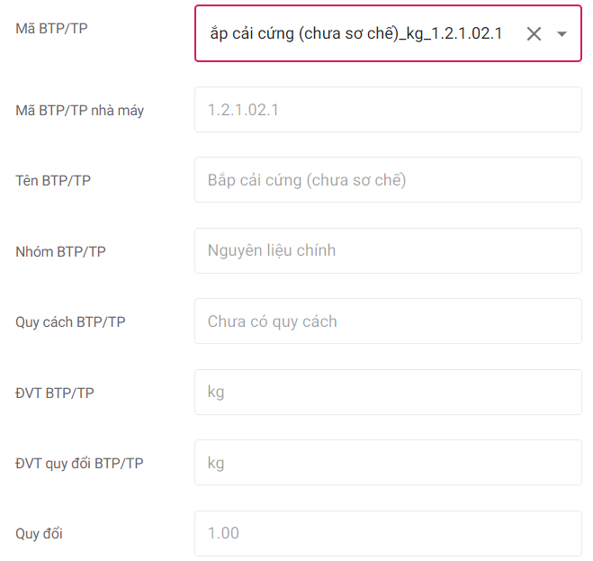 Ta có thể hiểu được là 1 ĐVT BTP/TP (kg) = 1 ĐVT BOM (Kg)