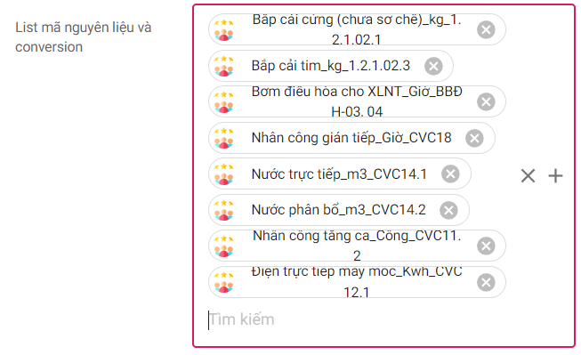 Với phần List mã nguyên liệu và conversion bạn cần chọn các mã cấu thành nên BOM. Ví dụ như các nguyên vật liệu, chi phí điện nước, nhân công, …
