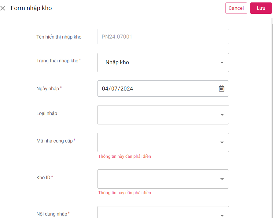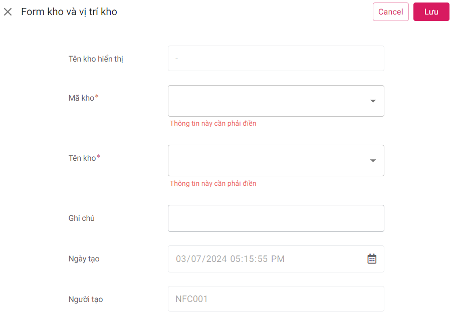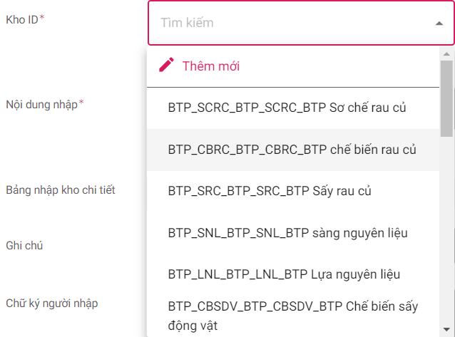 Trong trường hợp xưởng chưa được tạo thành công thì bạn ấn vào thêm mới và tiến hành tạo mã xưởng mới (Phần này chính là phần form tạo danh mục kho)