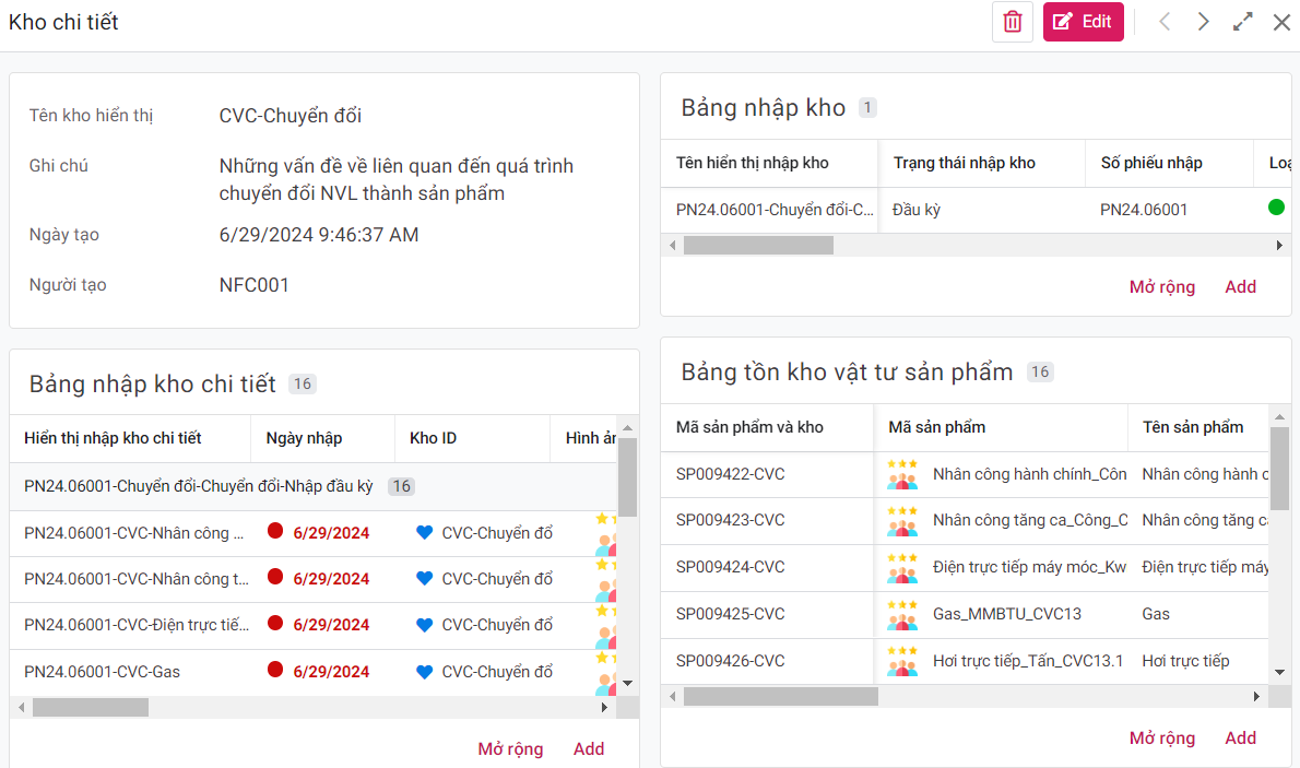 Trong trường hợp bạn muốn xem nhanh thông tin về kho tương ứng như thông tin kho, bảng nhập kho, bảng nhập kho chi tiết, bảng tồn kho vật tư sản phẩm thì bạn chỉ cần click vào tên kho tương ứng trong danh sách các kho là được.