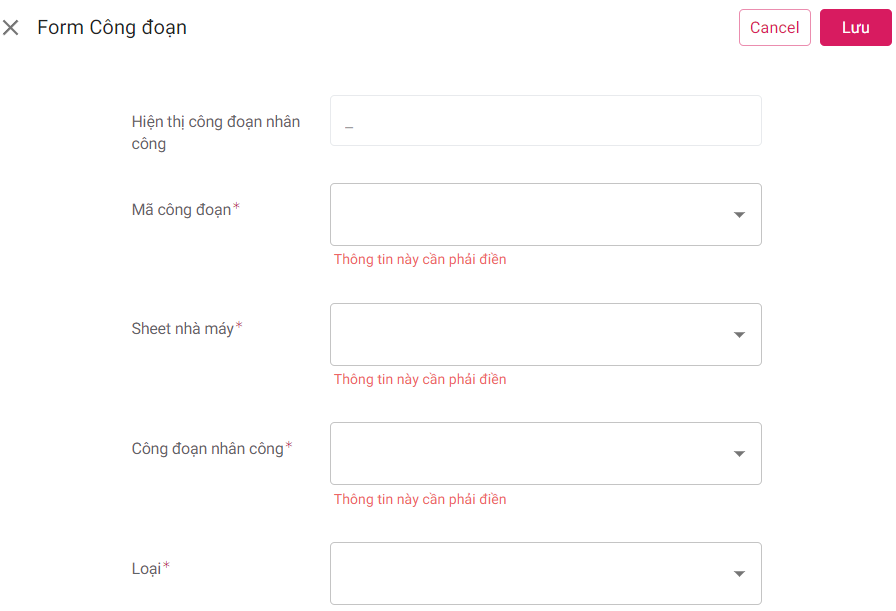 Các trường thông tin chỉ có chữ tìm kiếm thì bạn có thể chọn trong danh sách đã có, hoặc không thì bạn cần chọn tới thêm mới để thêm đầy đủ thông tin của Mã công đoạn này.