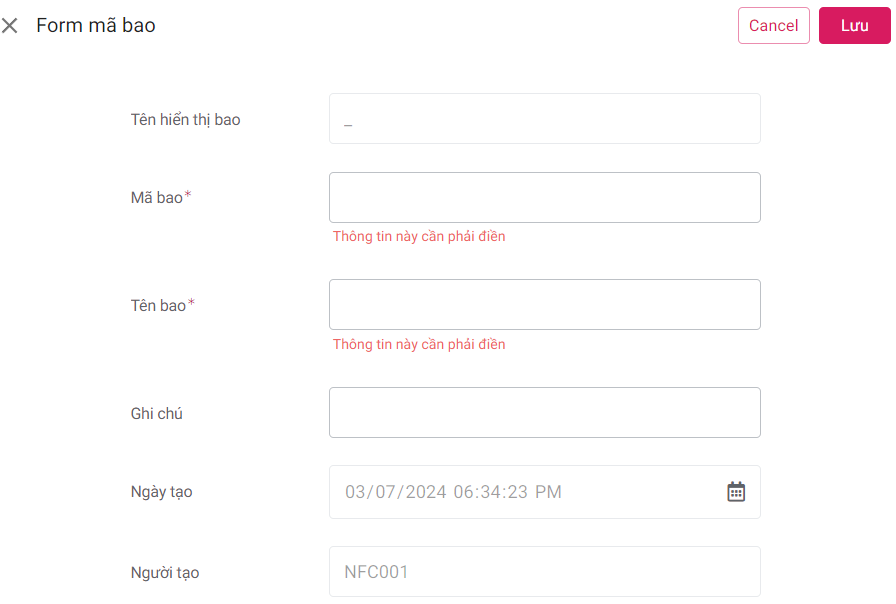Tại đây bạn hoàn thành khai báo Mã bao và tên bao là xong.
