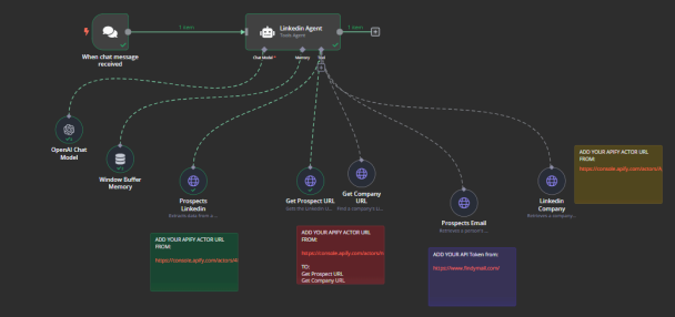 LinkedIn AI Agent là một công cụ AI tiên tiến, được thiết kế để tự động hóa quy trình tìm kiếm khách hàng tiềm năng (lead generation) và prospecting trên LinkedIn. Nó sử dụng sức mạnh của các công cụ hàng đầu như Apify, Findymail và mô hình ngôn ngữ OpenAI để trích xuất, phân tích dữ liệu và xác định các khách hàng tiềm năng phù hợp với mục tiêu kinh doanh của bạn.