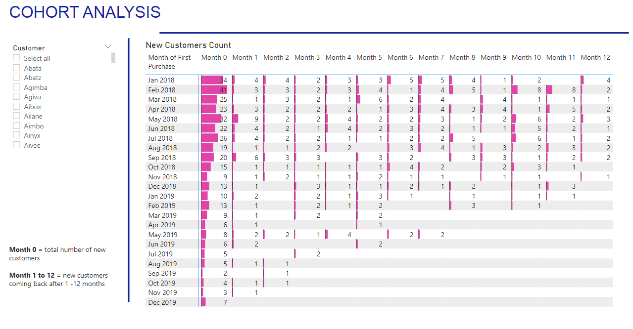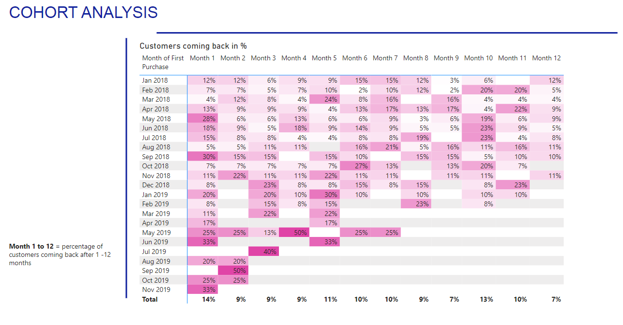 * Nhìn vào tổng số ở cuối báo cáo, chúng ta thấy rằng trung bình 14% khách hàng mua lại sau 1 tháng, sau đó chỉ 8% vào tháng thứ 2. Các tháng tiếp theo có số liệu thấp, ngoại trừ một đột biến vào khoảng tháng thứ 10.