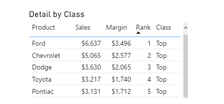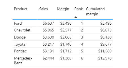RETURN SUMX(FILTER(ALLSELECTED('Sales table'[Product]), [Rank]<=currentRank), CALCULATE(SUM('Sales table'[Margin])))