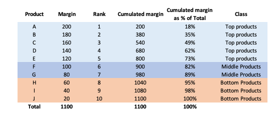 👉 Các sản phẩm từ A đến E không vượt quá 80% lợi nhuận, do đó chúng thuộc loại sản phẩm hàng đầu. Sau đó, các sản phẩm F và G không vượt quá 90% lợi nhuận nên thuộc loại sản phẩm trung bình. Cuối cùng, các sản phẩm còn lại H, I và J là sản phẩm cuối bảng.