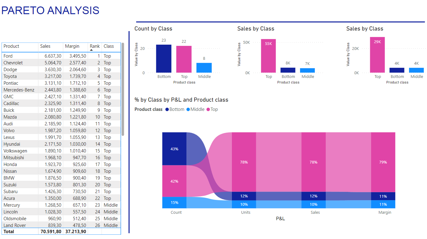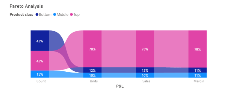 👉 Bảng điều khiển phân tích Pareto trong Power BI của chúng ta cho thấy 42% sản phẩm đem lại 79% lợi nhuận (sản phẩm hàng đầu), trong khi 43% sản phẩm chỉ đem lại 11% lợi nhuận (sản phẩm cuối bảng).