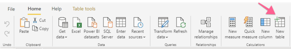 Bảng Phân Tích Rổ Hàng được tạo bằng một công thức DAX. Nhấp vào Home, New Table.