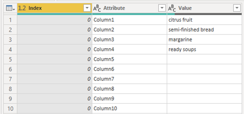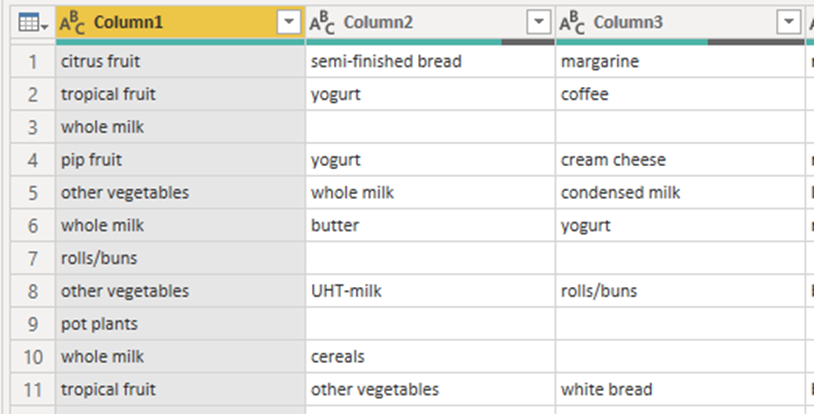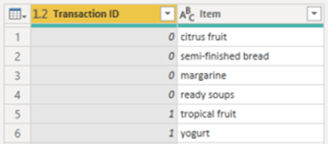 ✅ Bước cuối cùng cho việc tải dữ liệu là đổi tên các cột. Đổi tên cột đầu tiên thành 'Transaction ID' và cột thứ hai thành 'Item'. Bạn có thể đổi tên các cột bằng cách nhấp đúp vào tiêu đề cột.