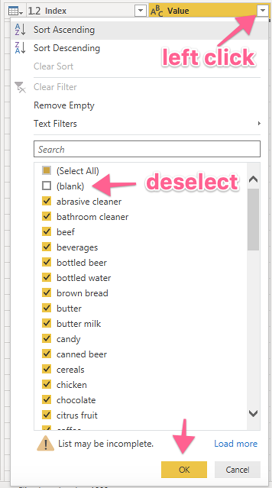 ✅ Cột Value cũng có các hàng trống cần xóa. Nhấp vào mũi tên bên cạnh nó, sau đó bỏ chọn (blank) và chọn ok. Điều này xóa các hàng trống khỏi bảng.
