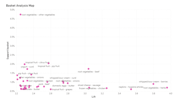 ✅ Biểu Đồ Phân Tích Rổ Hàng là một biểu đồ Scatter truyền thống, với các bộ lọc trên Lift và Support Basket như trước.