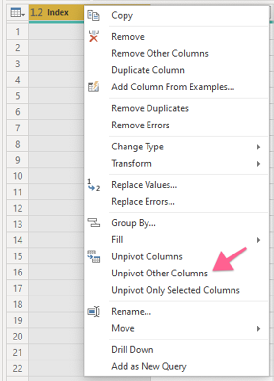 ✅ Bước tiếp theo là unpivot các cột với các sản phẩm. Nhấp chuột phải vào Index và chọn Unpivot Other Columns.