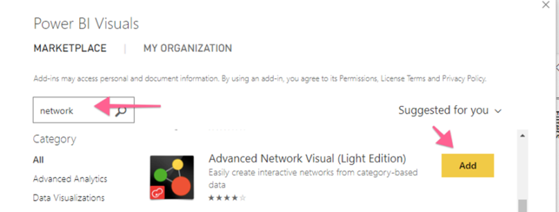 ✅ Biểu đồ mạng không phải là trực quan hóa tiêu chuẩn nên nó cần được nhập từ marketplace.