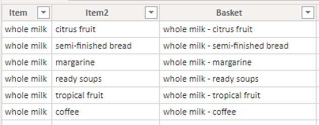 CROSSJOIN(VALUES('groceries'[Item]),SELECTCOLUMNS(VALUES('groceries'[Item]),"Item2", [Item])),