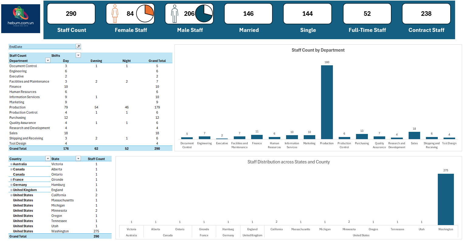 Phân bố nhân sự: Các lãnh đạo công ty muốn biết tổng số nhân viên và sự phân bổ của họ theo vùng, phòng ban, và cho các mục tiêu về sự đa dạng, theo chủng tộc/giới tính. Thể hiện điều này bằng biểu đồ cột hoặc biểu đồ thanh có thể xếp chồng hoặc cụm là một cách phổ biến để trực quan hóa. Ngoài ra, các công ty có kế hoạch nhân sự cho từng phòng ban có thể muốn hiển thị số nhân sự hiện tại bên cạnh số nhân sự mục tiêu. Nếu bạn có thể thể hiện cách số lượng nhân sự của công ty so với các công ty cạnh tranh có doanh thu tương tự, đó cũng là một thông tin tốt cho ban quản lý công ty. Bạn cũng có thể hiển thị tỷ lệ nhân viên HR so với các nhân viên khác trong công ty.