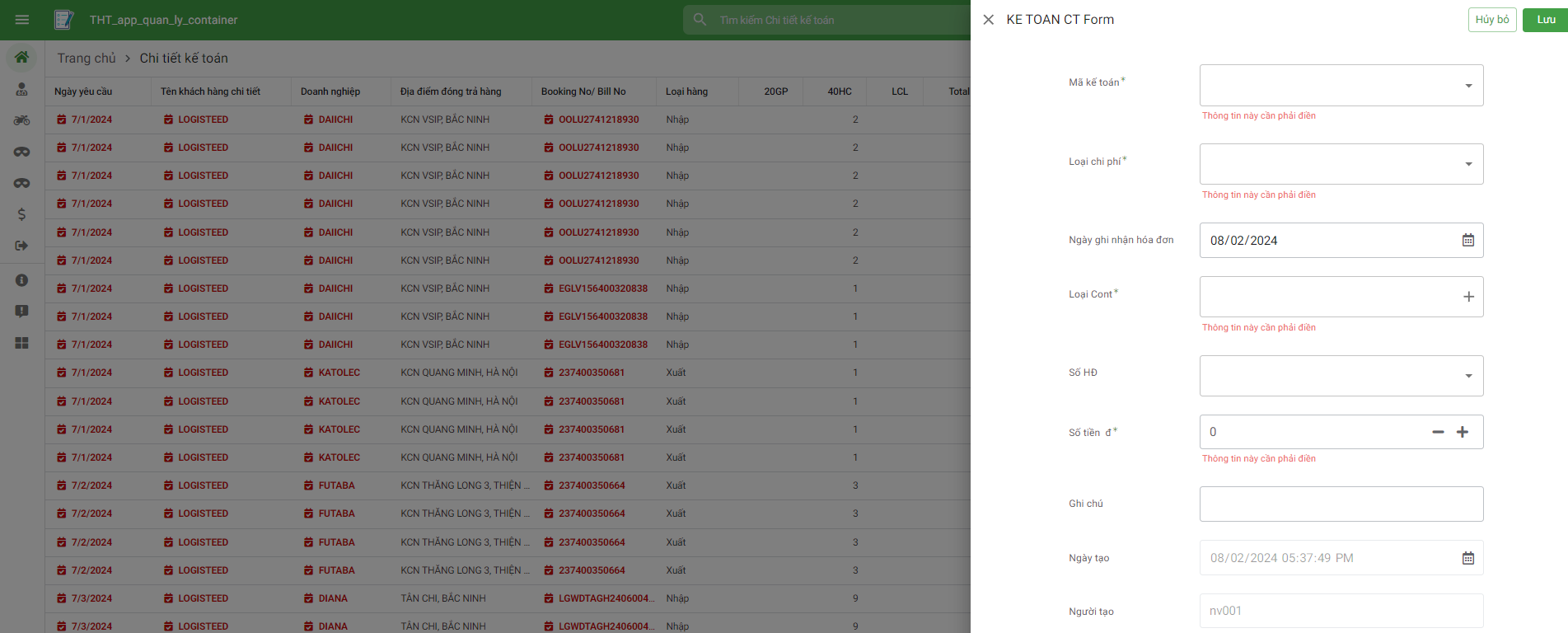 6. Quản lý chi phí cho tờ khai chuyển container theo khách hàng