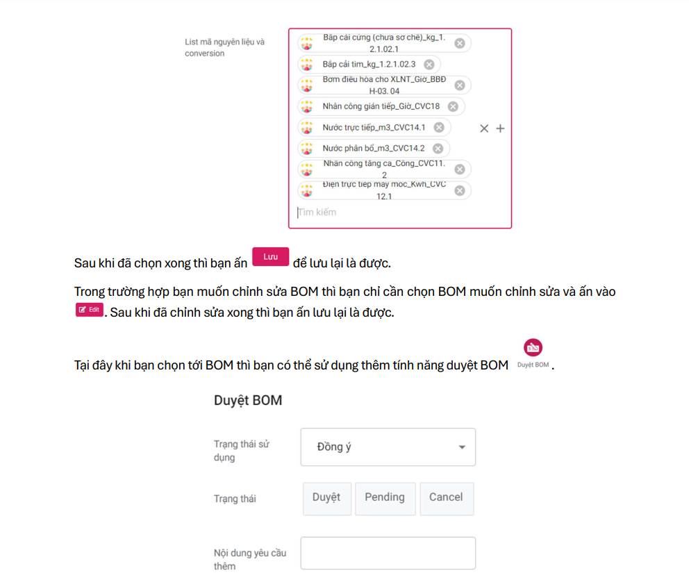 🔗 Khai báo định mức nguyên liệu cho từng công đoạn, sản phẩm hay đơn hàng. Có thể khai báo BOM nhiều cấp và khai báo các nguyên liệu thay thế trong BOM.