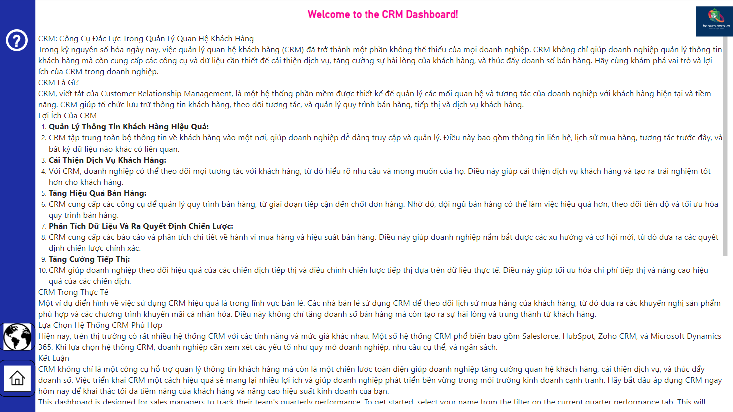 👉 CRM không chỉ là một công cụ hỗ trợ quản lý thông tin khách hàng mà còn là một chiến lược toàn diện giúp doanh nghiệp tăng cường quan hệ khách hàng, cải thiện dịch vụ, và thúc đẩy doanh số. Việc triển khai CRM một cách hiệu quả sẽ mang lại nhiều lợi ích và giúp doanh nghiệp phát triển bền vững trong môi trường kinh doanh cạnh tranh. Hãy bắt đầu áp dụng CRM ngay hôm nay để khai thác tối đa tiềm năng của khách hàng và nâng cao hiệu suất kinh doanh của bạn.